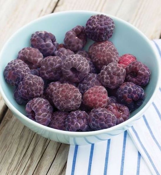 Le Rubus occidentalis Royalty est également nommé « framboisier noir » : en effet, ses fruits ressemblent à s’y méprendre à des framboises violettes foncées. En réalité ce n’est ni une framboise, ni une mûre, mais bien une espèce à part entière provenant du Canada.